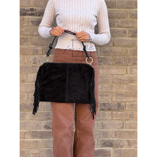 Large Suede Fringe Bag with Shoulder and Crossbody Straps: Handmade Genuine Italian Cowhide Suede Purse