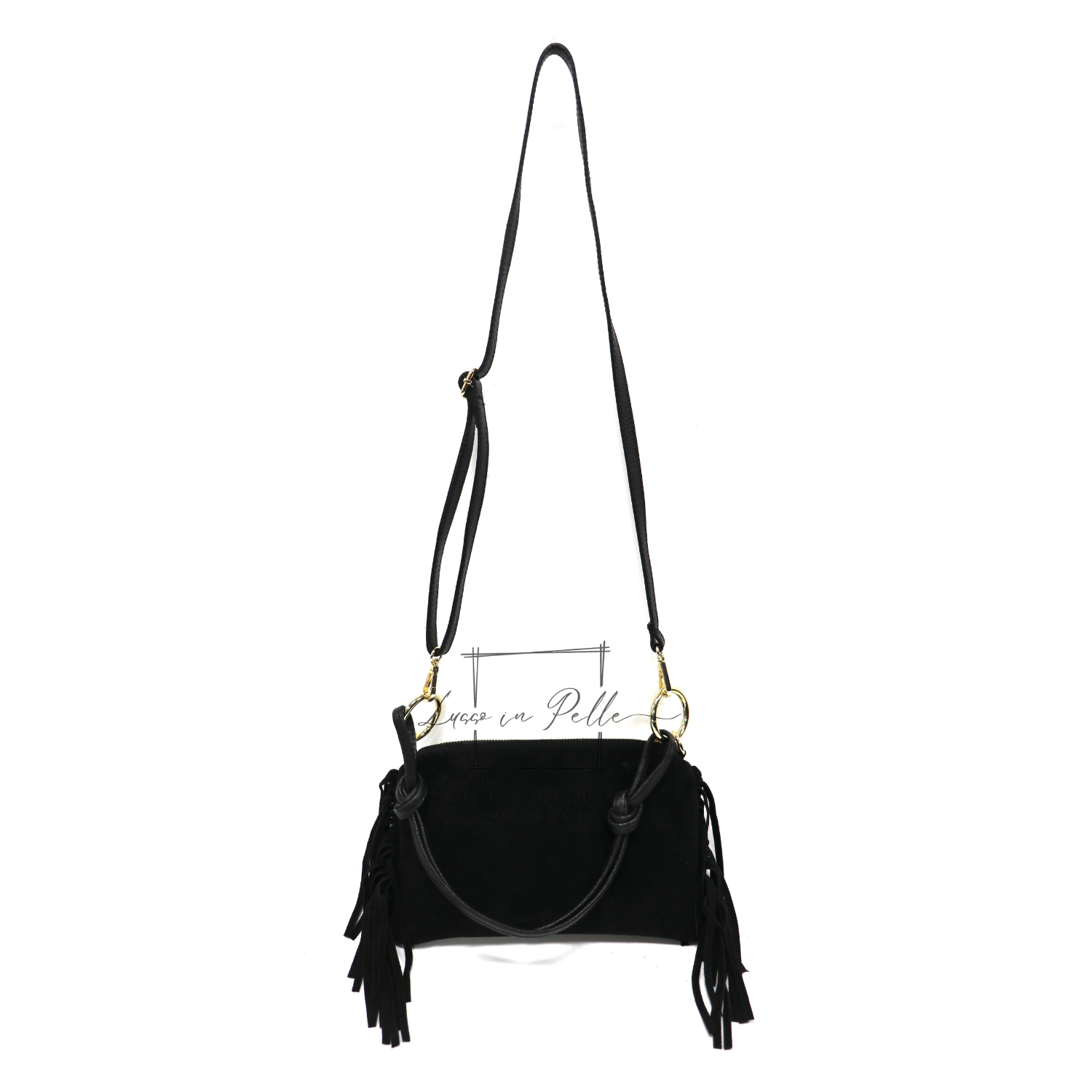 Small Italian Suede Fringe Bag with Shoulder and Crossbody Straps: Handmade Genuine Cowhide Suede Flat Purse