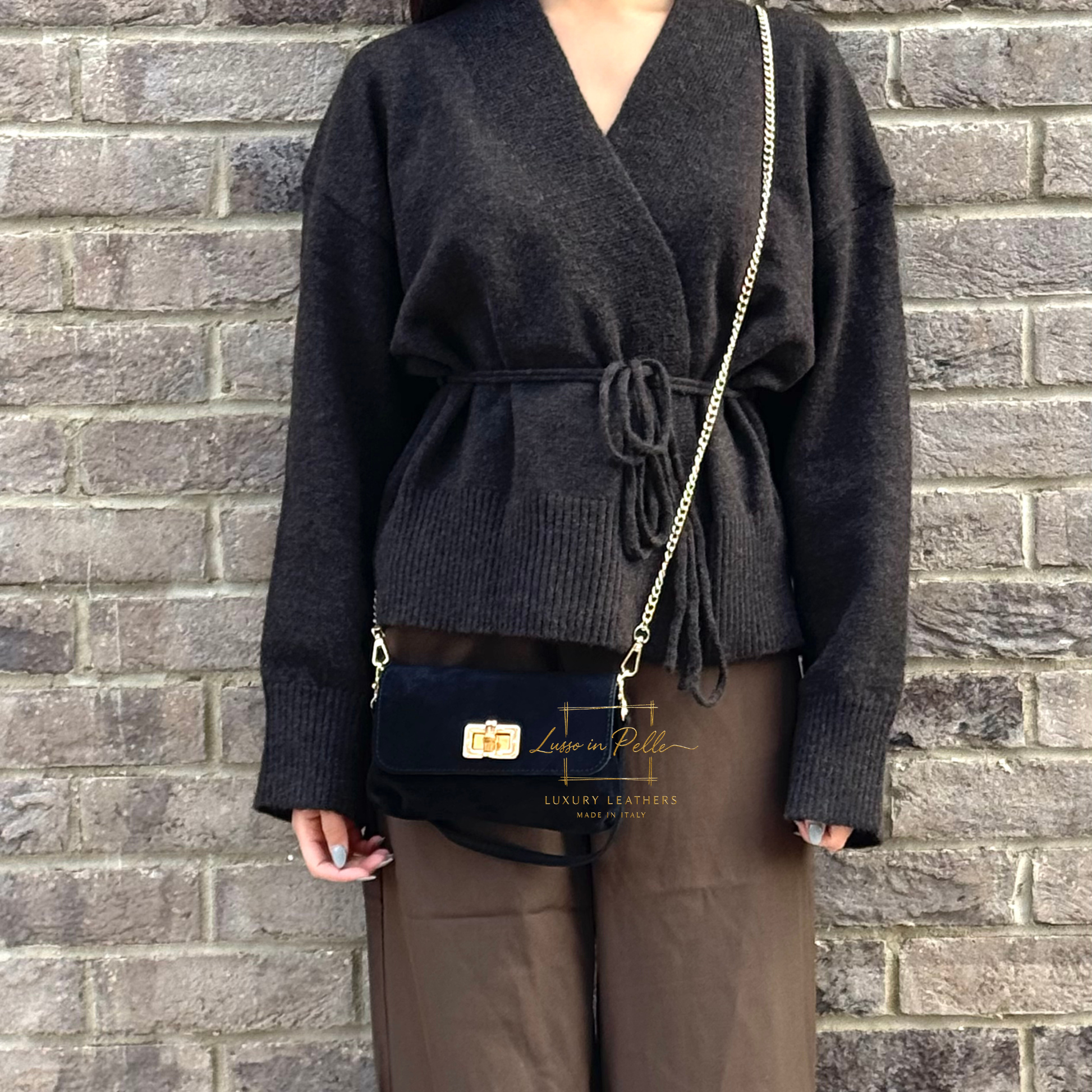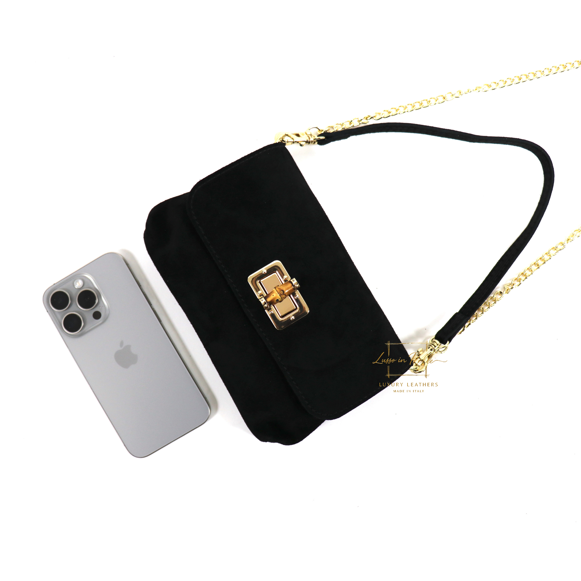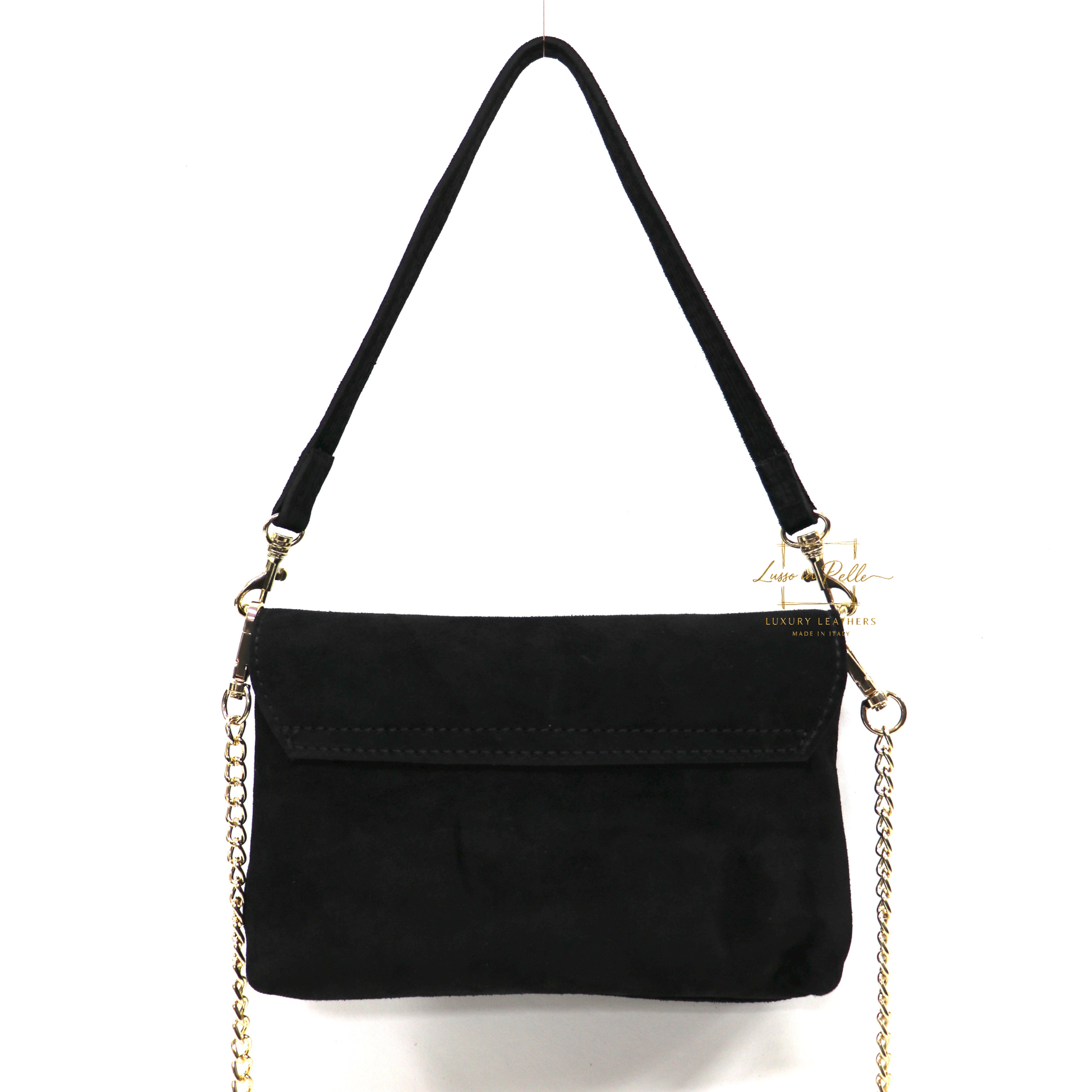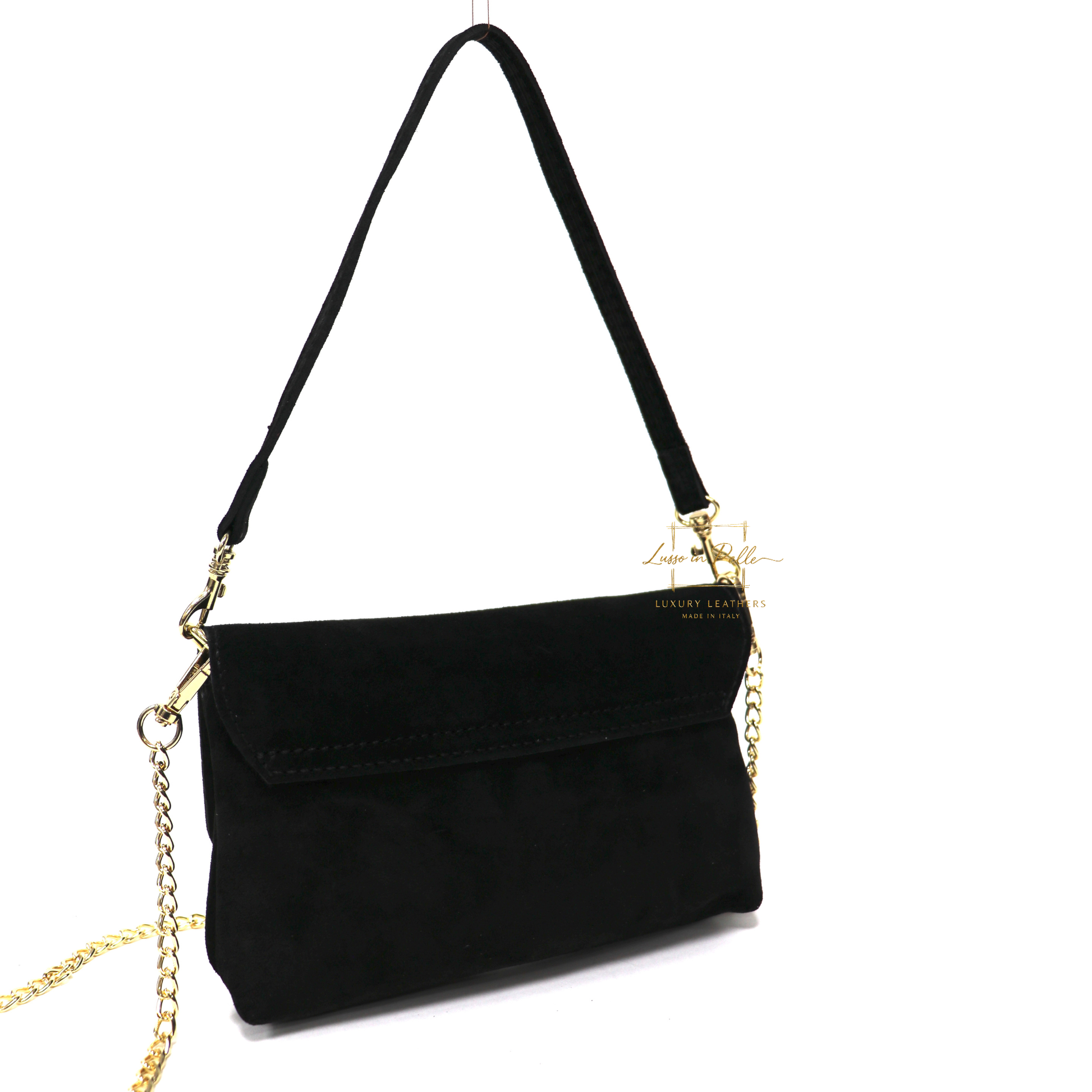 ✓ Detachable suede shoulder strap and gold chain crossbody strap